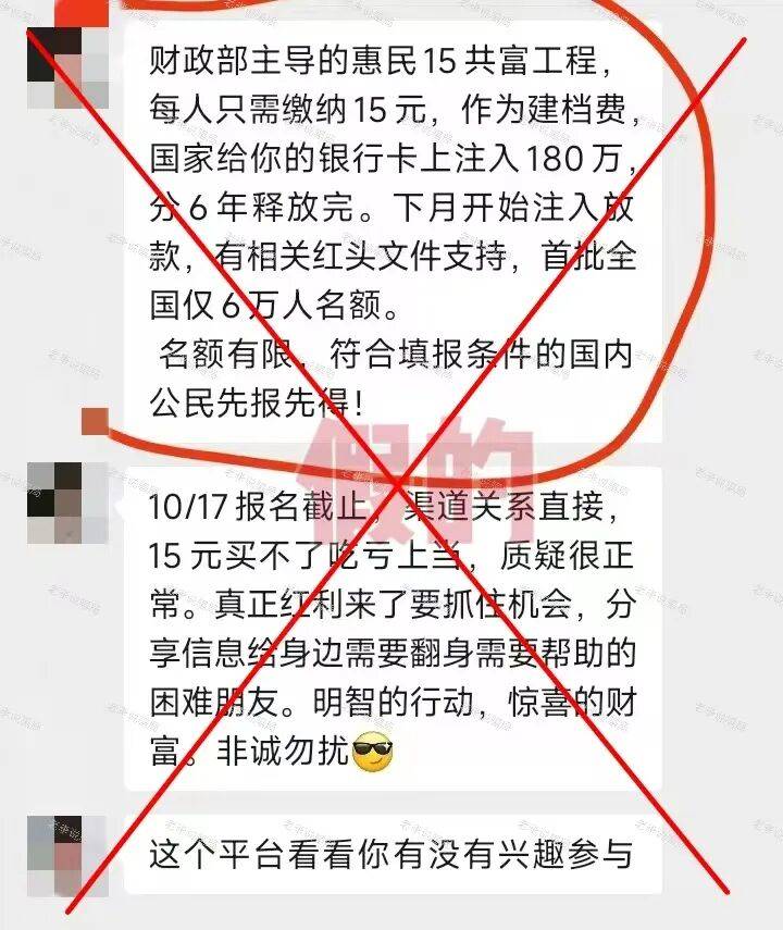 假的!骗子谎称国家福利政策,诱导参与者缴纳15元并填写详细个人信息,号称可获得国家注资180万的银行卡。此番操作实际为了收集参与者个人信息,为后续精准诈骗做准备,信息被泄露的参与者很可能面临“洗钱”等各种法律风险,远离!