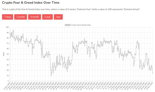 市场情绪指标正在印证这种极度悲观的氛围。据华尔街见闻文章,11月13日,币圈恐慌与贪婪指数暴跌至15点,创下今年2月以来的最低水平。