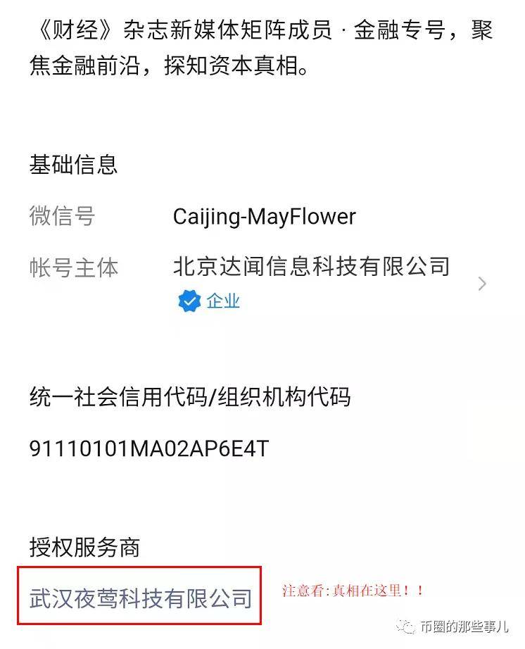 账号简介:《财经》杂志新媒体矩阵成员,矩阵懂吧,连加盟商都不算,运营主体“北京达闻信息科技有限公司”(企业),再看后面的授权服务商“武汉夜莺科技有限公司”,我再给你们看看: