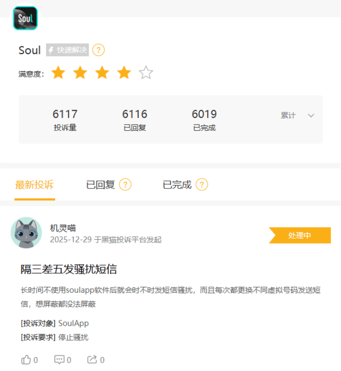 在黑猫平台上检索“Soul”,截至12月29日,投诉量累计达6117条,已完成6019条,其中近30天的投诉量为63条,已完成11条。投诉内容包括但不限于收到骚扰短信、平台无故扣费乱收费等。