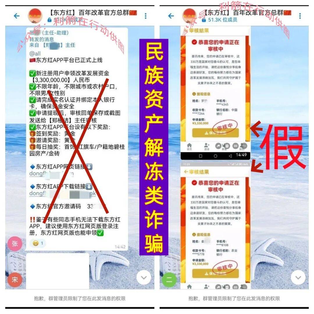 群里不少中老年人疯狂的提交自己及家人的身份信息“申请提现”,显示“申请正在审核中”?不过永远不会到账的,反而还会要求被害人交各种各样的费用,骗走一个个被害人的钱,这是民族资产解冻类诈骗项目。