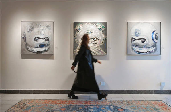 刘清路从北京到迪拜的地理位移,为“企鹅”符号注入了新的时空维度。在国际化的语境下,这个符号不再仅仅指向某个具体的社会模型,而关乎全球化浪潮中的文化迁徙、身份认同,乃至一种去地域化的、普遍的人类处境。企鹅,这些来自极地的精灵,在艺术家构建的抽象场域中,成为了永恒的迁徙者与观察者,凝视着我们所处的这个既高度连接又充满无形区隔的世界。在“秩序剧场”的特定节点,我们将邂逅“宇航员”系列作品,这些画面往往剔除了繁复的社会性构图,将身着宇航服的形象——与“小鹿”的童年意象结合。它们如同嵌在秩序幕布上的几扇舷窗,或来自遥远深空的独白,他们背对喧嚣,凝视深空,或悬浮于无垠。这种绝对的“独处”,是精神彻底内转的瞬间。这则星际寓言,与周围的“企鹅剧场”形成了最为关键的凝视与对话。它们以沉默而巨大的存在提醒我们:那令人安心的秩序边际之外,始终存在着一片需要独自面对的、浩瀚的心灵星空。