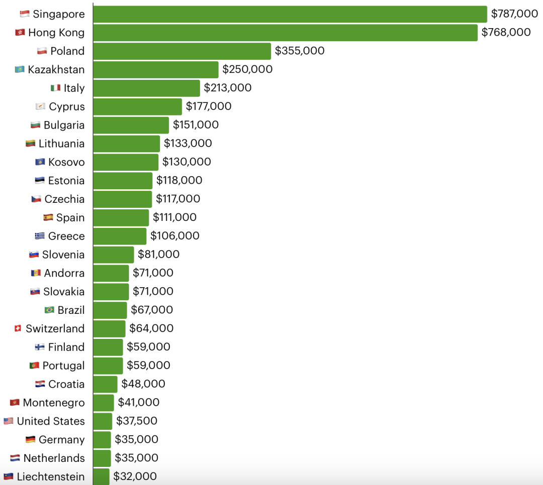 世界上最慷慨的国家是新加坡,奖金高达约63万欧元。中国香港地区的奖金则更高,大约65万欧元。返回搜狐,查看更多