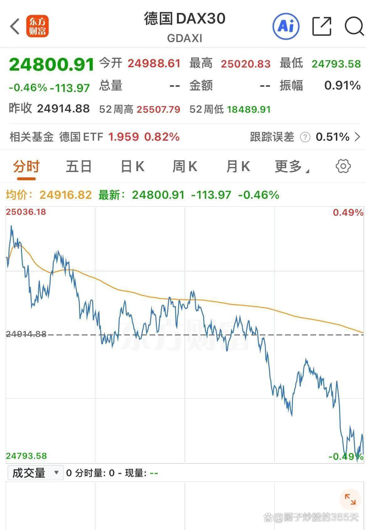 视线日,欧洲主要股市的表现几乎是美股期指的翻版,甚至更弱。 英国富时100指数开盘后一度上涨0.51%,但盘中遭遇抛压,最终仅收涨0.22%,报10473.69点。 德国DAX指数走势更为疲软,它开盘上涨0.48%,随后便一路震荡下行,盘中毫无抵抗,最终收盘下跌0.46%,报24800.91点,日线图呈现一根明显的阴线%,尾盘下挫后勉强收红,微涨0.04%。 广泛代表欧洲股市的欧洲斯托克50指数,同样高开低走,最终下跌0.11%。 欧洲市场的集体高开低走,反映出投资者情绪的普遍谨慎和脆弱,任何风吹草动都可能引发获利了结。
